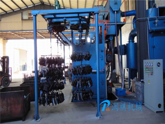 工件隨吊鏈可連續(xù)運(yùn)行、步進(jìn)運(yùn)行或采用積放推式懸鏈輸送工件,使工件在裝卸料以及拋丸區(qū)分別處于停止?fàn)顟B(tài),實(shí)現(xiàn)定點(diǎn)裝卸和定點(diǎn)拋丸工序,根據(jù)工件不同可單點(diǎn)吊重50~2000kg,且生產(chǎn)率高,運(yùn)行可靠,對各類易吊掛類零件的大批量清理,非常適用。如發(fā)動(dòng)機(jī)缸體缸蓋、電機(jī)殼體、齒輪、摩托車發(fā)動(dòng)機(jī)殼體、機(jī)車鉤尾框組件、轉(zhuǎn)向架組件、五金工具殼體、水泵等清理效果尤佳。通過拋丸清理,不但可以去除工件表面的銹蝕,清理掉結(jié)構(gòu)件上的焊渣,還可以消除工件的焊接應(yīng)力,提高工件的抗疲勞強(qiáng)度,增加工件噴漆時(shí)的漆膜附著力,并達(dá)到提高整個(gè)工件表面及內(nèi)在質(zhì)量的目的。是汽車、拖拉機(jī)、柴油機(jī)、電機(jī)、閥門等行業(yè)的理想選擇等。一般可按照用戶產(chǎn)品要求設(shè)計(jì)制作。